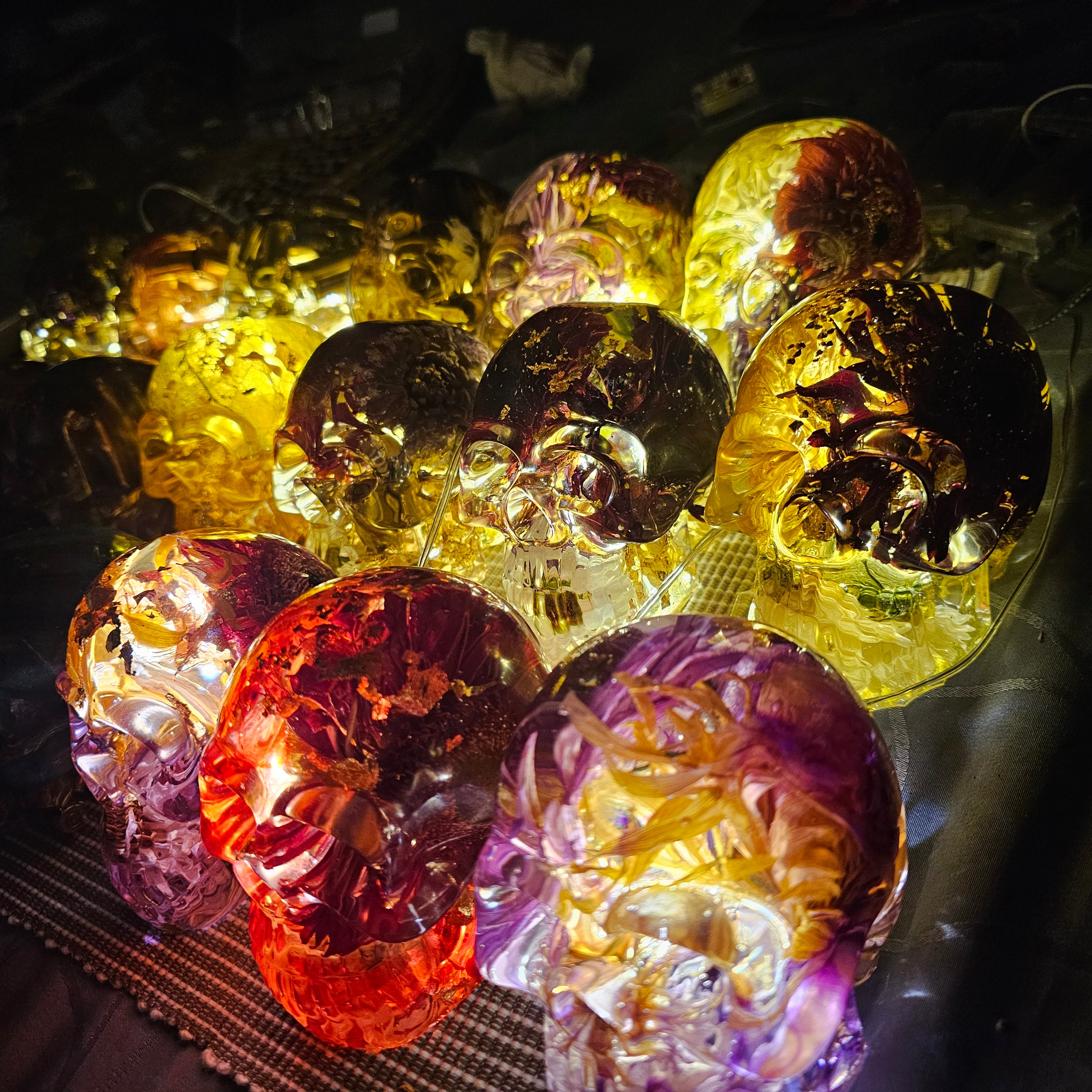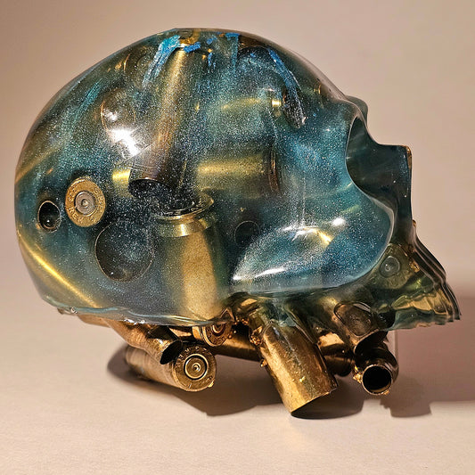 #0259 Handmade Resin Skull - Mixed brass in silver pigmen/blue resin. One of a kind for sure.