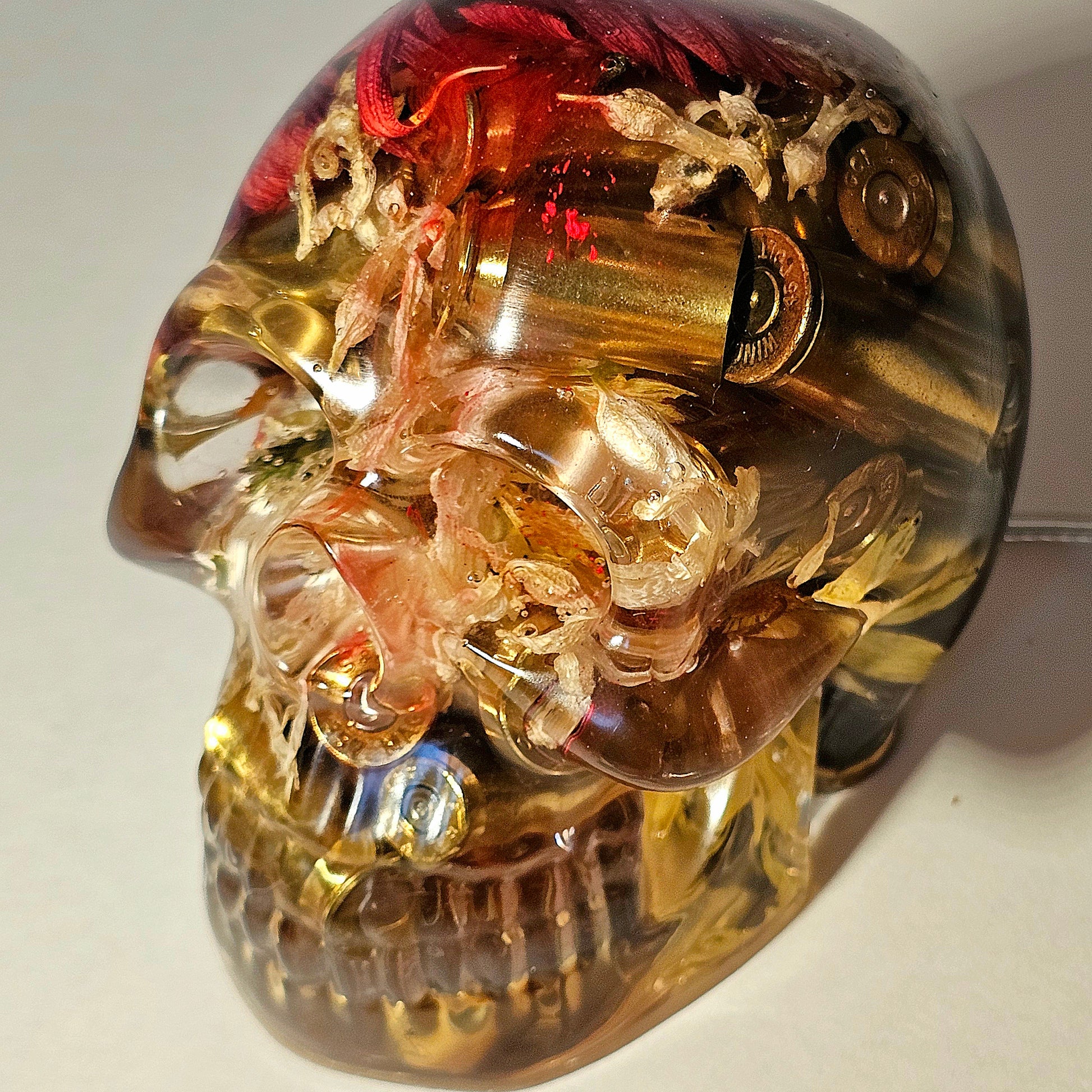 #0263 Handmade Resin Skull - Mixed flowers with brass in clear resin, very nice piece. HAS LIGHTS. Battery operated.
