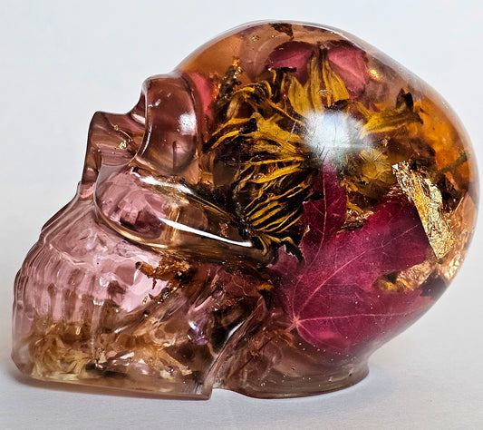 #0261 Handmade Resin Skull - Mixed flowers in warm light red resin.